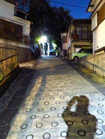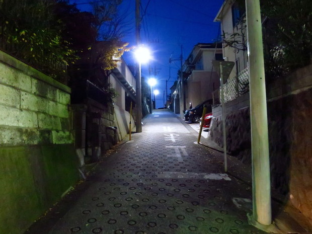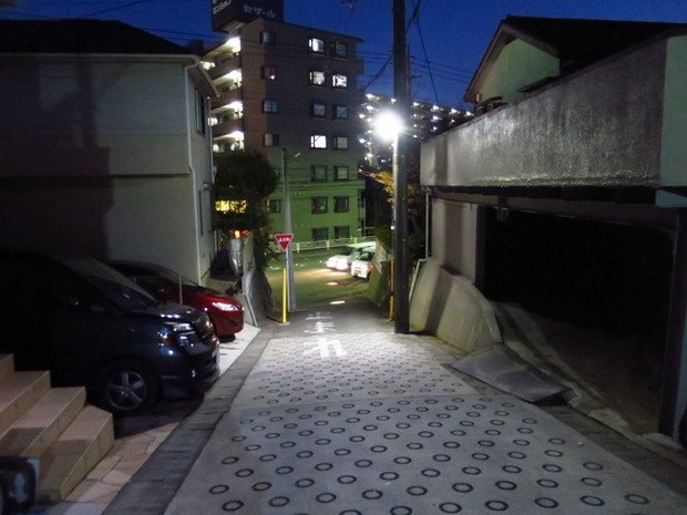 さて、測り終わって坂を上ってくると、左に向かって下るなかなかの勾配を発見。お、これはきっとと降りていくと、果たしてその先には予想を軽く上まわる急坂が待ち受けていた。そして、周囲にここを上回る坂が見つからなかったので、ここを投稿にあった坂とした。
