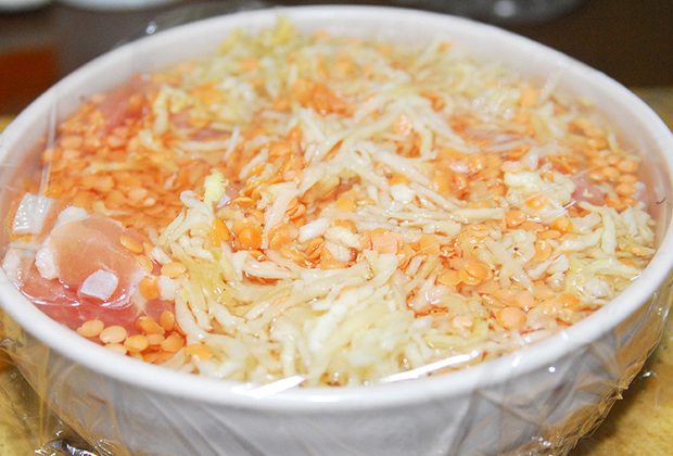 耐熱容器に、レンズ豆、カットした鳥肉、タマネギ、水で戻した切り干し大根を入れて水を300cc加えます。