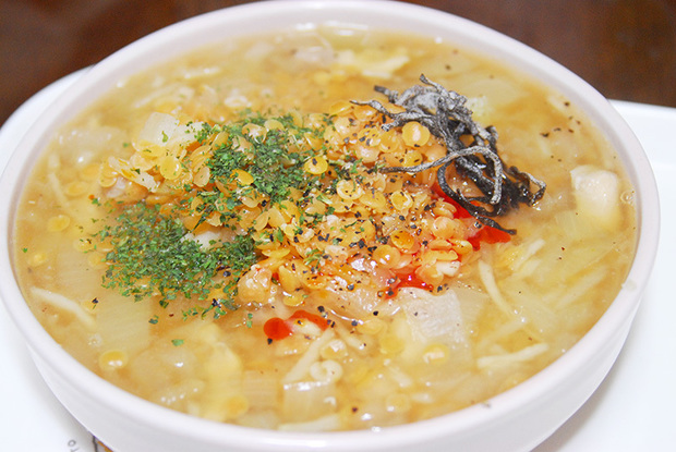 今回は、塩味ベースにしましたが、同じ味なら飽きてしまいかねませんので、コンソメブイヨンを入れたり、カレーパウダー、味噌などで味の変化を加えてみてください。レンズ豆はクセがない食材なので、意外によく合います。