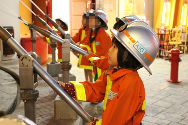 消防署パビリオンでは、スーパーバイザーが英語でご挨拶! 「今、なんて言ったの!? 」なんて、見守るママの方がドキドキ。キッザニアでは、E@K(English@KidZania)というこども達がパビリオンでの職業体験を通して、自然に英語に触れられるプログラムを、すべてのパビリオンで実施しています。
