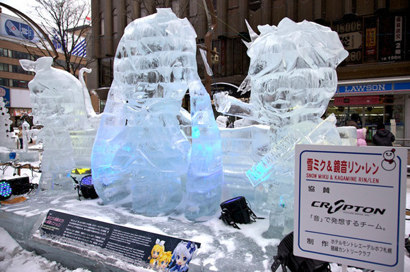 そのまま歩いて今度はすすきの会場へ。入り口すぐのところにミクさんの氷像がありました。脇侍のように立っているのは初音ミクと同じボーカロイド用音声ライブラリソフトウェア「鏡音リン・鏡音レン」のキャラクター。ミクさんとリン・レンだけは日中からライトアップされていてちょっと特別扱いのようでした。