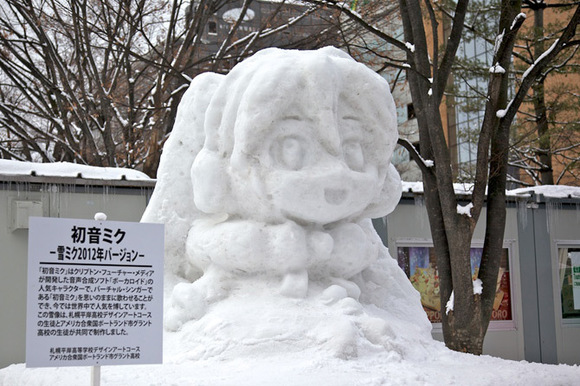 大通会場に入って最初に見つけたミクさん像。こちらは地元高校の学生さんによって作られたもの。これとは別にクリプトン社公式の雪ミク像があるのですが、まだ見つけられません。この数日前、公式の雪像が倒壊するというニュース(→『さっぽろ雪まつりで倒壊した「雪ミク」雪像、再度製作が決定』)があり、この像を見る観光客や地元の方々の口からは「頑張って作り直したのねぇ」という声が度々聞かれました。でも、こちらは倒壊したミクさんではないんですよ…。