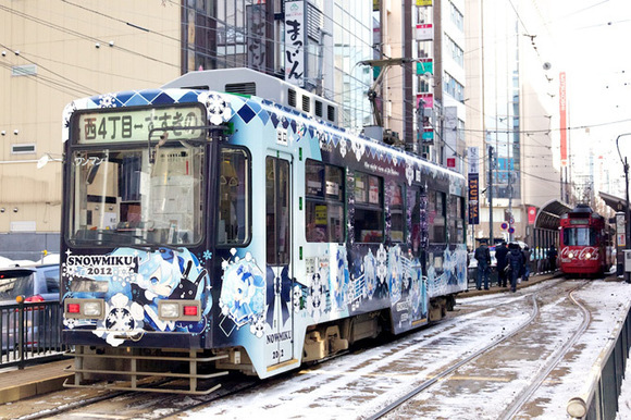 翌日。朝食もそこそこに、大通公園へ。雪まつり期間中、雪ミクさんラッピングされた市電が走るということで、これは写真に納めておかねば記事のネタがありません。昨夜のオフ会でラッピング電車の運行スケジュールはばっちり仕入れてきたので無問題。西4丁目駅の手前で待ち伏せること数分。11時少し前になって、完璧なタイミングでラッピング電車に遭遇です。