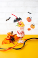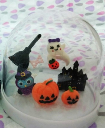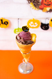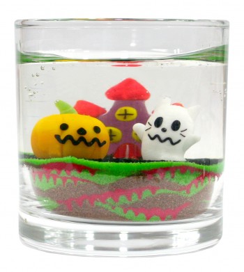 カラフルな砂で模様を作り、ガラスのオバケやカボチャなどのパーツを選んで飾り付けをしてハロウィンキャンドルを作ることができます。