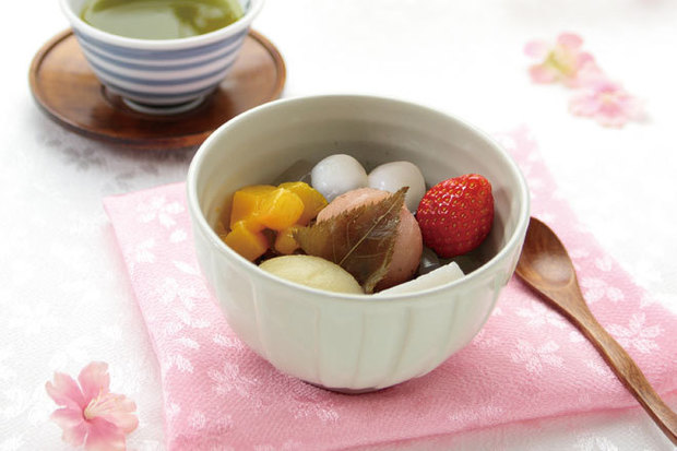 風味豊かな桜あんを使用した季節限定のあんみつ。黄桃、白桃、苺と彩り豊かなフルーツと一緒に。