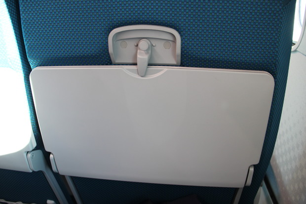 電光掲示板に最新のニュースが流れたり、車内販売のお姉さんがワゴンを押して出てきても何ら違和感ありません。座席にはよく見るレバーを横にひねって前に倒すタイプの机もついてます。