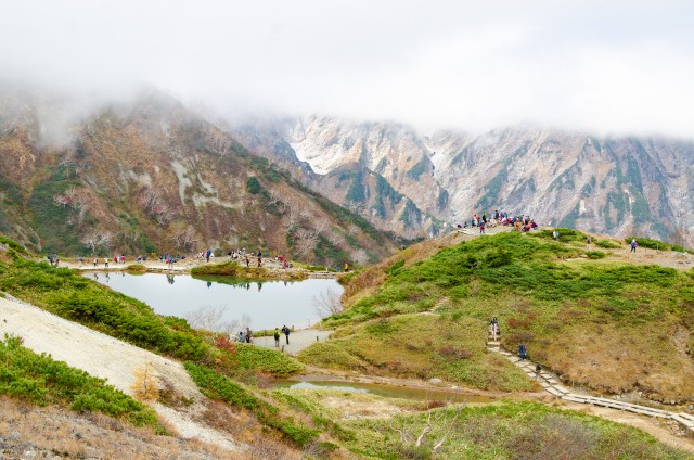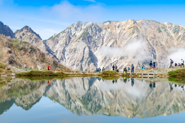 白馬三山から天狗ノ頭、不帰嶮などの山々の素晴らしい威容が、八方池のまるで鏡のような水面に映り込み、時間を忘れて見入ってしまうほど。