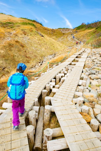 尾根をトラバースする木道コース。遠回りのような気がするものの、高低差が緩やかかつ、歩きやすい木道なので、おすすめ