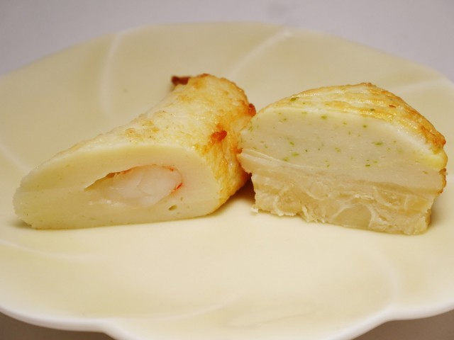 種もの入りの揚げたてかまぼこは種類も多く、特におすすめは、大きなホタテ貝柱が丸ごと一個入った「ほたほた揚げ」と、ぷりぷりの海老一本入りの「えび天」です。ピリッと胡椒がきいた大きな粗挽きソーセージ入りの「メガソーセージ」は、ぜひ、揚げたてをその場で!