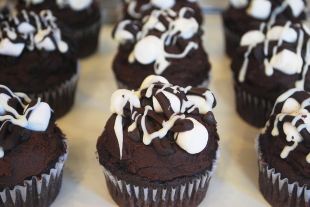 チョコレートカップケーキの上にさらに濃厚なチョコレートバタークリームを乗せて、チョコチップやマシュマロをトッピングしています。