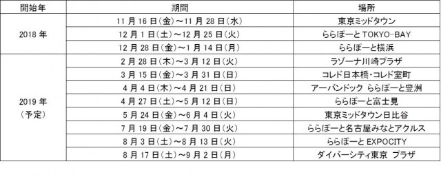 東京ミッドタウン 2018年11月16日(金)をスタートに、三井ショッピングパーク ららぽーとTOKYO-BAY 12月1日(土)、ららぽーと横浜 12月28日(金)と順次開催し、約1年をかけて関東、関西、中部地方の三大都市圏に展開予定です。