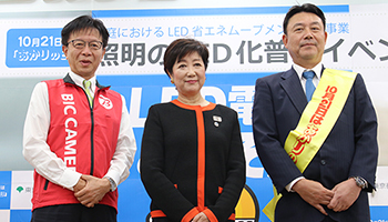 ビックカメラは10月22日、「ビックカメラ有楽町店」で、10月21日の「あかりの日」にちなんだ「照明のLED化普及イベント」を実施した。会場には小池百合子東京都知事や、日本照明工業会筆頭の平岡敏行副会長、ビックカメラの宮嶋宏幸代表取締役社長が登場し、白熱灯からLED電球へ交換した際のメリットなどを説明。省エネへの協力を訴えた。
