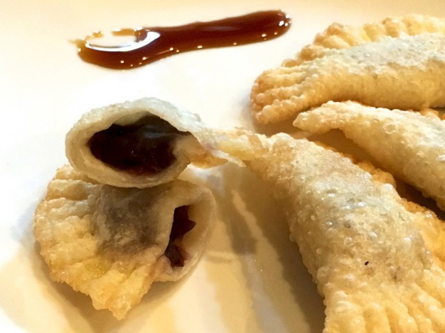 「お待たせしました。『バタあんこ揚げ餃子』です。黒蜜で食べてください」