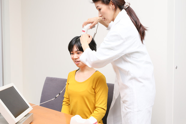 「編集部Tさんは、透きとおった美しい地肌ですね。ぶつぶつもなくキレイです。現状では頭皮トラブルにはなっていませんが、肉眼で見ると赤みを感じさせる箇所が若干ありますので気をつけましょう」