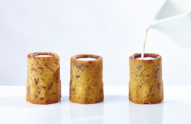 クッキー生地のショットグラスにバニラミルクを注ぐ「クッキーショット」