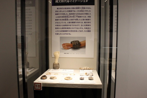 貝で出来たブレスレットをかたどった土製の腕輪。イミテーションダイヤや、フェイクファーを身に着ける現代人のように、縄文人も今の私達とあまり変わらない感覚を持っていたのだな、と思うと急に親しみが湧いてくる。
