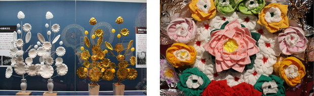 タオルで出来たものや、缶詰などが入ったものも。これらもニセモノだが、祝い・悲しむ気持ちを精一杯表す方法のひとつであることに変わりはない。最近ではまた生花で作られるケースも増えているそうだ。時代によってホンモノを使うのか、ニセモノを使うのかも変わってくる。