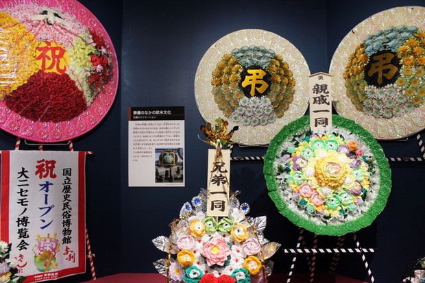 お祝い事や、お葬式の時に使われる花輪。元々は生花を使っていたが、時代と共に大きさが変わり、造花でも作られるようになったそう。海外のリースに由来するものだが、地域や風習に合わせて変化していった。