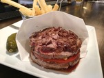 このハンバーガーは、ひき肉を使っていないのだ。食べやすいサイズにカットしたステーキ用アメリカ牛で作ったパティ(180グラム)をバンズではさんで食べる。