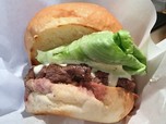 心地よい食感、噛みごたえのある、つなぎ不使用のパティが、愉快この上ない。ステーキを食っている感覚。