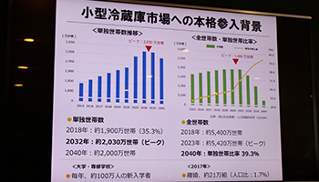 単独世帯向けの小型冷凍冷蔵庫に注力する理由について、プロダクトディレクション部の岡田剛マネージャーは、「人口減少が進んでいる中、世帯数は増加傾向にある。2040年には、単独世代が4割ほどになるという予測がある。また、一人暮らしをスタートする方は年間約21万人とされている。このような日本の状況にあわせた家電の需要は今後も続くだろうと考え、商品を考案している」と説明する。