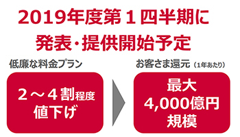 同日に公開した決算関連資料の「社長メッセージ」には、「料金プランが『複雑で分かりにくい』というお客様の声を真摯に受け止め、シンプルで分かりやすい料金プランに大胆な見直しを行います。さらに、この料金プランの導入にあわせて、2~4割程度ご利用料金を低廉化させ、1年あたり最大4000億円規模となるお客様還元を実行いたします。料金プランについては2019年度第1四半期の発表・提供開始を予定しております」と記載され、見直し時期まで明らかにした。大胆な見直しになるという。