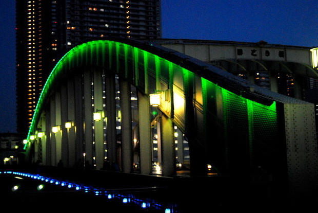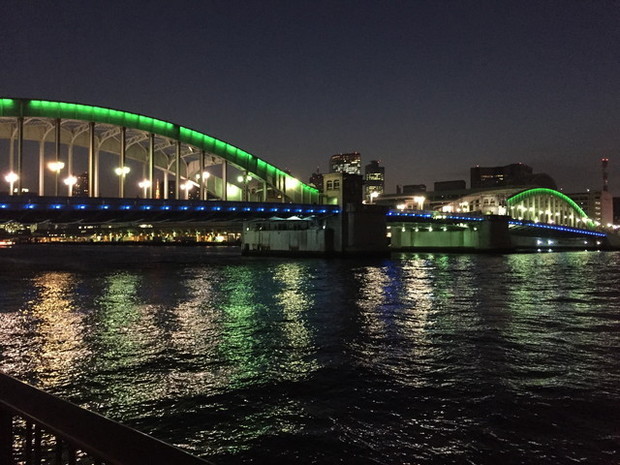 これから秋までは、川べりから夜の勝どき橋を眺めるのもいいですね。デートの時の散策にも、悪くないコースだと思いますよ。
