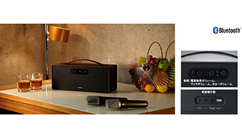 「PS-BK20M」は、デュエット対応の高音質Bluetoothカラオケスピーカー。本体には8.5cm×2基のバスレフ型スピーカーを搭載し、会議やセミナー、イベントなどでワイヤレススピーカーとしても使える。バッテリ駆動時間は本体が5時間、付属のワイヤレスマイクが3時間。税別の実勢価格は1万9800円前後の見込み。