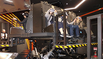 hexaRideは、4人掛けで3方向の合わせて12人が一度に乗れる台湾・ブロージェントテクノロジーズ製の「Q-Ride」というVRマシンを導入している。ユーザーがヘッドマウントディスプレイを装着して360度VR映像を見ると、その映像に連動して油圧式のVRマシンが上下、前後、左右、左右の傾斜、左右の旋回、前後の傾斜と6方向に可動する。ユーザーは、浮遊感や疾走感、大小さまざまな振動、コンテンツ内における爆風など、コンテンツへの没入感が楽しめる。