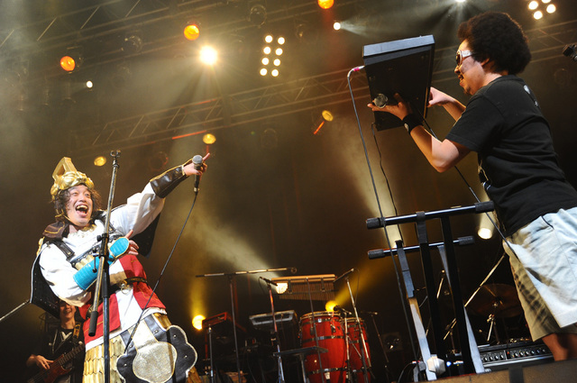 元SUPER BUTTER DOG のメンバーであり、現在は中村一義らとともに100sのメンバーとして活動する池田貴史がフロントマンを務めるプロジェクトは、そのユニット名通り、言ってみれば“歴史”の伝道師(笑)。誰もが知っている日本史ネタにユーモアセンスをたっぷり散りばめた楽曲の数々は、バカバカしくもあり(ほめ言葉です!)、そこはかとなく知性を感じさせるようなさせないような独特すぎる世界観!金ピカの甲冑に身を包んだやっつんも登場した『きらきら武士』は、まさに“キラキラ星”のようなミラーボールの光がムーディーに輝く中で、池田が高らかに歌い上げるメロディにキュンキュンきてしまう。武士!武士!武士──!池田とオーディエンスがコール&レスポンスしているフレーズは冷静に考えると「何なんだこれは!?」と首を傾げてしまうが(笑)、超本格派なファンキー・サウンドと池田のソウル・フィーリング抜群なボーカル・ワークはあまりにも魅惑的。豊か過ぎるほど豊かな遊び心をおふざけには感じさせない理由は、その見事なパフォーマンス・スキルがあるからこそだ。そして、『妹子なぅ』は“マウス小僧JIROKICHI(堂島孝平)”、『狩りから稲作へ』は“足軽先生(いとうせいこう)”&“東インド貿易会社マン(グローバー義和/Jackson Vibe)”がステージに合流!O-EASTのオープニング・ステージを華やかな共演で飾ってくれた。