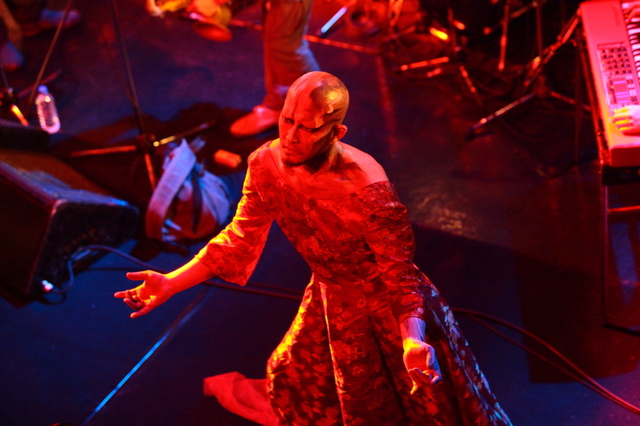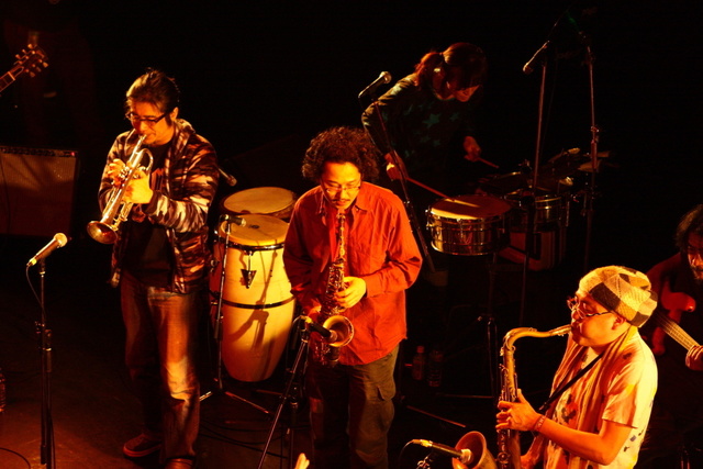 この日のギター、ベース、ドラム、キーボード、パーカッション編成によるセッションは、厳かな響きを鳴らし続けたかと思えば一転、スカ風の超昂揚的な演奏でフロアの人波を揺らし、その変化に富んだサウンドに合わせてパフォーマーも様々な動きでステージを彩る。この次はどうなるんだろう……??先の展開が予測不能で一瞬も見逃すことができないステージと、心と身体を踊らせるプリミティヴなグルーヴは、思わず瞑想状態になりそうなぐらい恍惚的な空間だった。