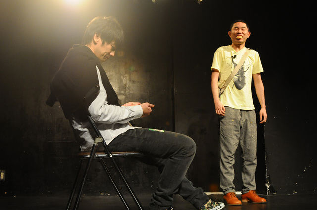 そして音ネタの白眉はこの人、マキタスポーツ。長渕から桑田の真似を取り込んだ曲から、完全にビジュアル系になりきって歌いきった曲(ちなみに見た目はそのまま)、「なにも心に残らないのをやります」と言って、リゾート的な映像をバックにただただ爽やかなだけという曲…などなど。高い批評精神と音楽性にあふれる彼のステージは、とにかく見ていて楽しくて仕方がない。そんなステージが終わった後、マキタスポーツは「ノドの調子がわるかったんで不安でしたが、楽しかったですね。今日のお客さんって、音楽のことを知ってるじゃないですか。だからすごくよくわかってくれるし、やりやすかったですね」と、スッキリした表情で語ってくれた。