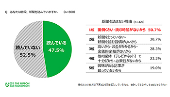 第2回のテーマは「新聞」。普段、新聞を「読んでいる」と回答したは約半数の47.5%。新聞を読まない理由としては、「面倒くさい・読む時間がないから」(50.7%)がもっとも多く、「新聞をとっていない・読む習慣がないから」(30.7%)、「高いから・お金がかかるから・金銭的余裕がないから」(28.3%)と続いた。