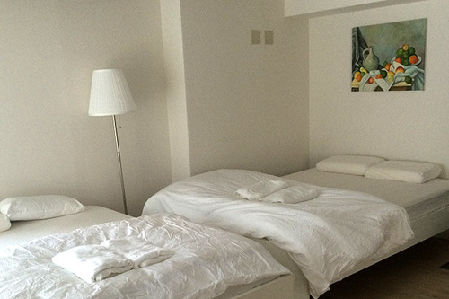今回は7人で宿泊。ベッドが2つと、ベッドになるソファが2つ。そして、7名分のふとんがありました。寝室側は、白ベースで、お洒落な絵もかかっていました。
