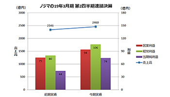 ノジマが11月7日に発表した2019年3月期第2四半期(18年4~9月)の連結決算は、売上高が2460億1200万円(前年同期比5.1%増)、営業利益が94億900万円(同26.0%増)、経常利益が105億5800万円(32.2%増)、親会社に帰属する四半期純利益が73億8200万円(68.4%増)と、増収増益になった。