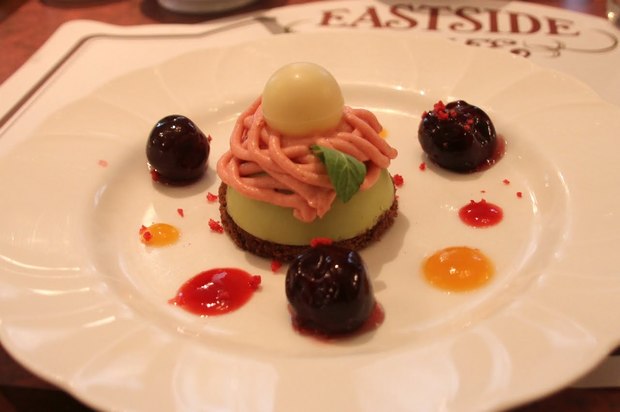 中央のデザートは、下からチョコスポンジ・ピスタチオムース・ストロベリークリーム、ホワイトチョコレート。