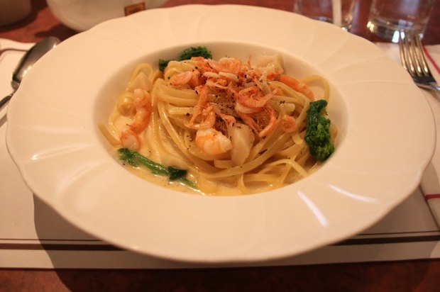 桜海老の他にサーモンや菜の花も添えられ春らしい彩りのパスタは、クリームソースに溶け込んだ魚介の味がパスタに絡みついていきます。