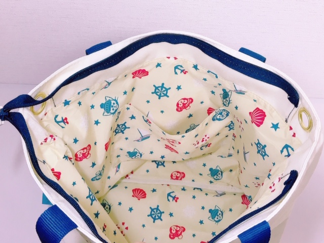 紺色のイラスト面全体が深くて大きなポケットになっています。