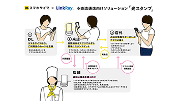 事前に、ファミリーマート、ウエルシア、TSUTAYA、マツモトキヨシ、モスバーガーをはじめとする「光スタンプ」導入店舗のカードをアプリに追加し、「スマホサイフ」アプリのカメラを起動して、店舗にある「LinkRay」対応卓上発信機に向かってカメラをかざすだけで、アプリ内にスタンプがたまり、スタンプ数に応じてクーポンなどの特典が付与される。