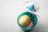 あずきクリームとストロベリージャムが入った2種類の丸いスポンジケーキは、手を汚さずに食べられるので、食べ歩きにもおすすめです。