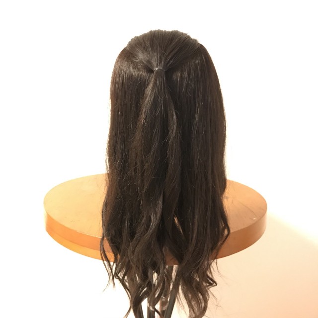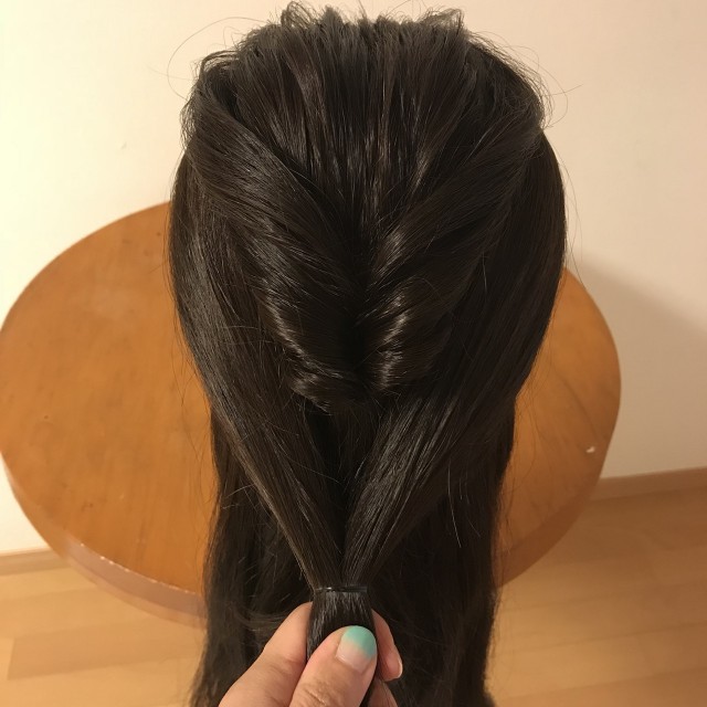 1.まずは、髪の毛を上の方で表面の毛だけとって結びます。