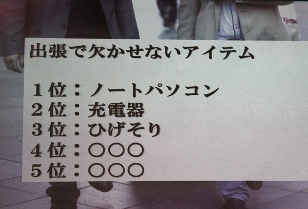 1位:ノートパソコン 2位:充電器 3位:ひげそり 4位:【 】 5位:【 】