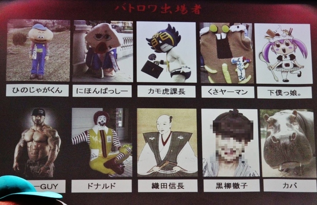 参加するのは今回の出演キャラに加え、先ほどの「ぼくの考えた最強ご当地キャラ」で生まれた『下僕っ娘。』と『センターGUY』。そしてなぜかドナルド、織田信長、黒柳徹子、カバと、豪華な顔ぶれだ。