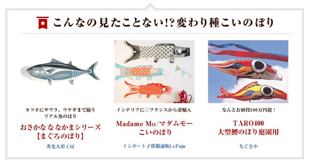 楽天市場ご当地総研では、こんな変り種こいのぼりが紹介されていました。