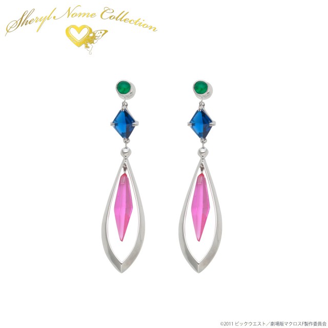 マクロスF10周年を記念して、10金にキュービックジルコニア、ピンクサファイア、ブルースピネルを使ったシェリルらしいゴージャスな仕上がりとなっており、ピアス仕様とイヤリング仕様をそれぞれ用意しています。