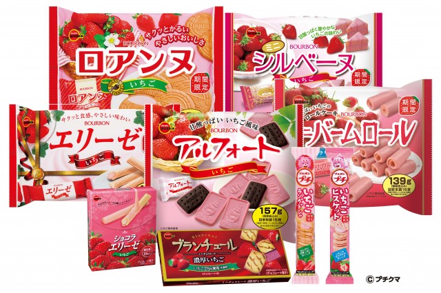 ブルボンの“いちごフェア”商品9品が、2018年11月27日(火)より期間限定で登場。人気のあのお菓子もすべて“いちご味”になっています。