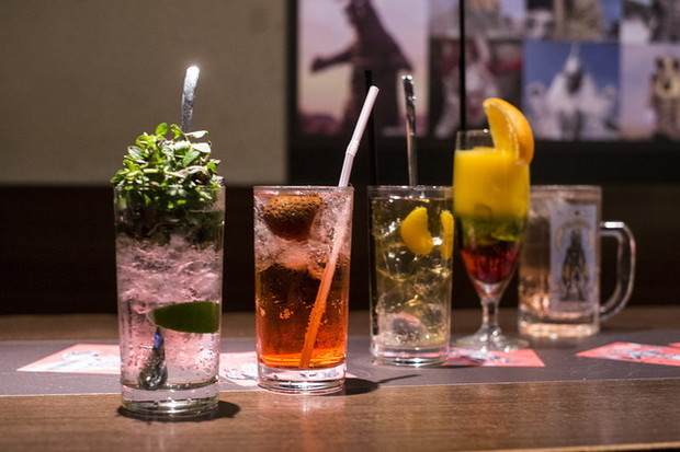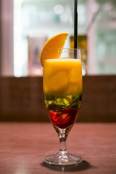 メトロン星人をイメージした3色のカクテル(混ぜると夕焼け色になるそう)