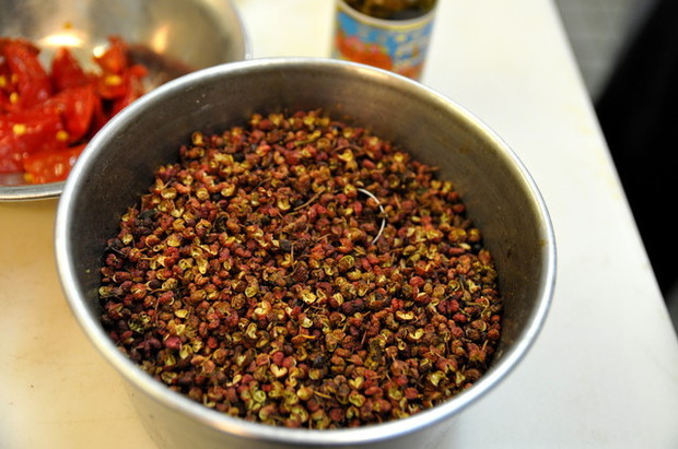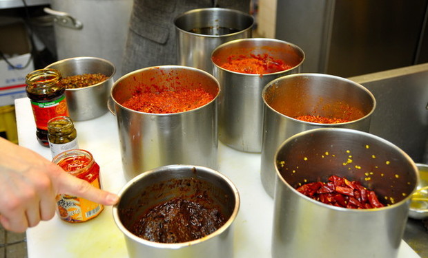 見ているだけでも発汗作用がありそうな・・・。このほか、自家製辣油や中国で人気のピーナッツ辣油、四川省のきめが細かい豆板醤、唐辛子とニンニクの調味料、野山椒という青唐辛子の酢漬けが使われている。