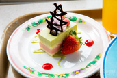 イチゴが一粒添えられたパステルカラーのムースケーキは、ピスタチオとストロベリーの2層になっています。