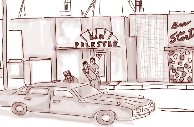 舘ひろしが歌う「冷たい太陽」が流れる中、赤レンガ倉庫前を走る2人 (エンディング再現イラスト:ナリタノゾミ)